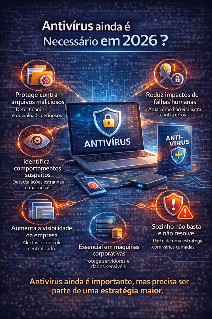 Em 2026, antivírus ainda é necessário, principalmente em ambientes corporativos. Ele continua sendo uma camada importante para reduzir riscos e identificar ameaças, mas não pode ser a única defesa. Segurança digital de verdade é feita com conjunto de medidas, processos bem definidos e cultura de prevenção.